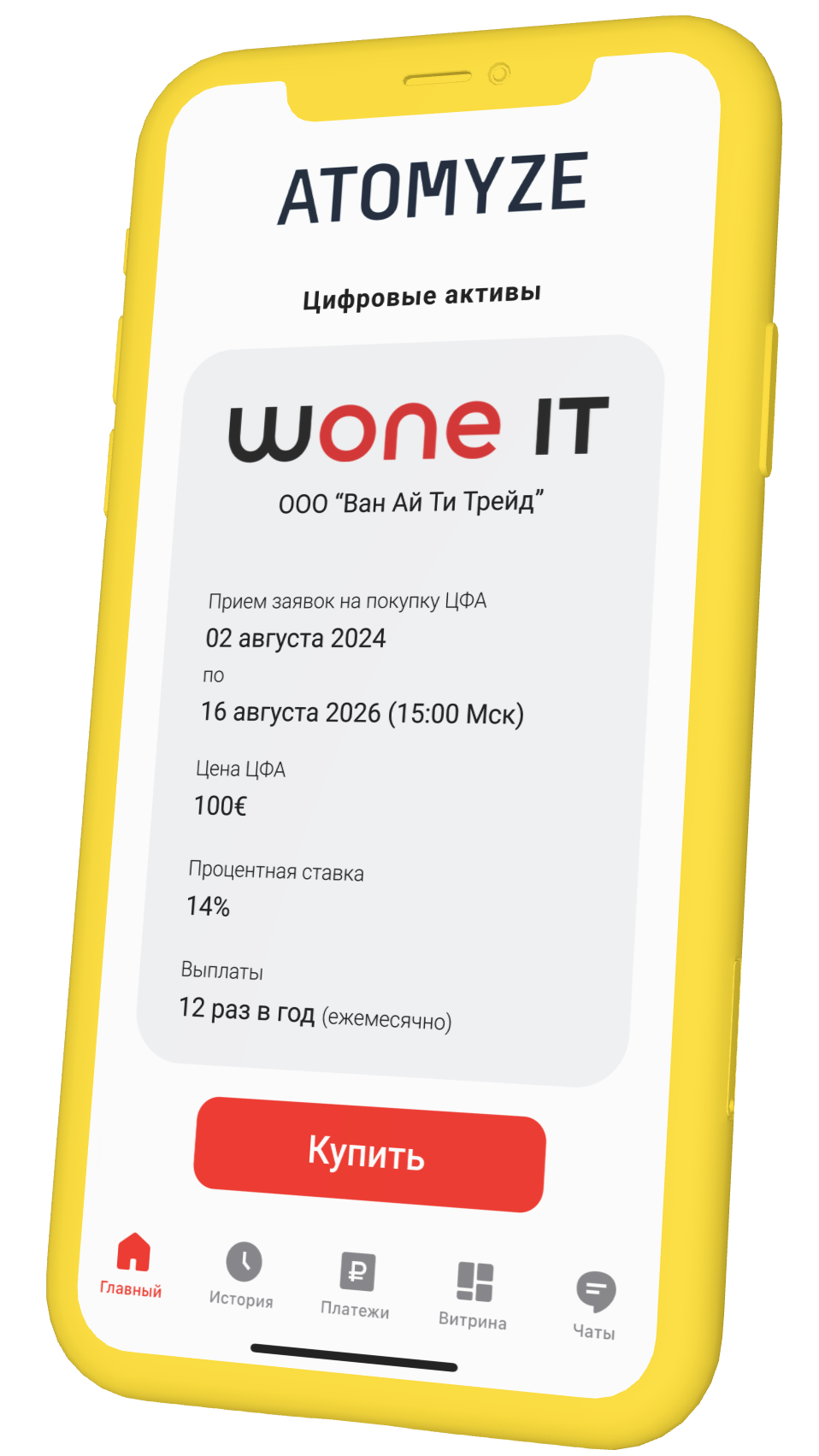 Выберите ЦФА Wone IT (ООО “Ван Ай Ти Трейд”). Прочитайте решение о выпуске ЦФА, подготовленное эмитентом. Самое важное в нём — условия, при которых выпуск состоится. Отправьте заявку и оплатите стоимость с расчетного счета